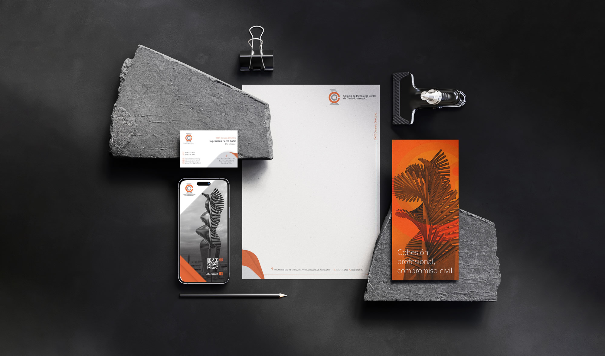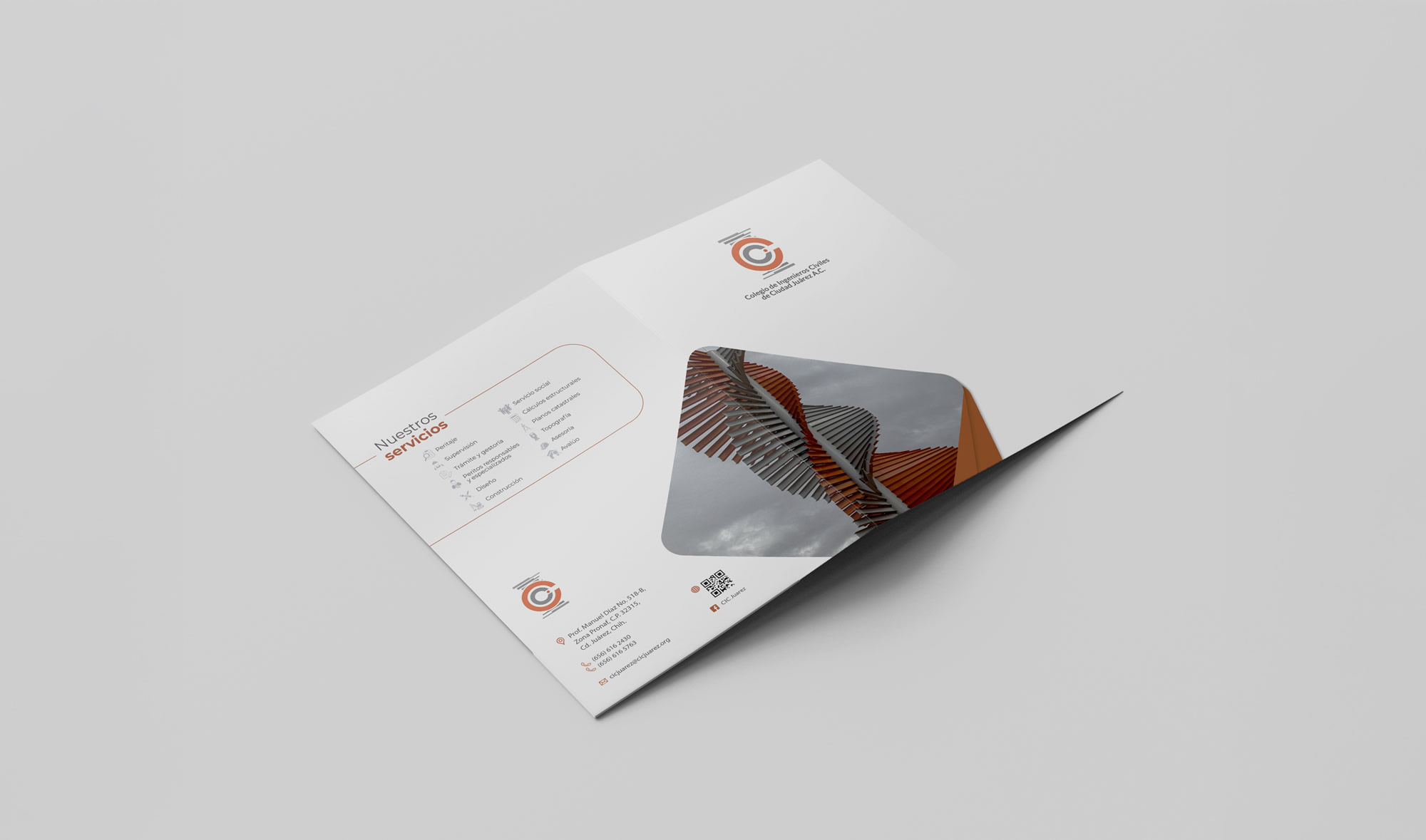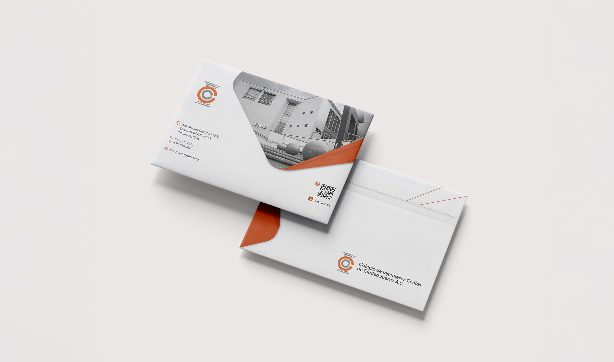Diseñamos la identidad visual del Colegio de Ingenieros Civiles de Ciudad Juárez, partiendo de la adaptación de su logotipo anterior. Se optó por un estilo flat design, eliminando los efectos tridimensionales para lograr una imagen más actual y versátil. La propuesta integra una paleta cromática en tonos naranjas y grises, que transmite energía y solidez, además de la silueta de la estructura exterior del edificio Cepia como elemento distintivo, reforzando el vínculo entre la institución y su patrimonio arquitectónico.